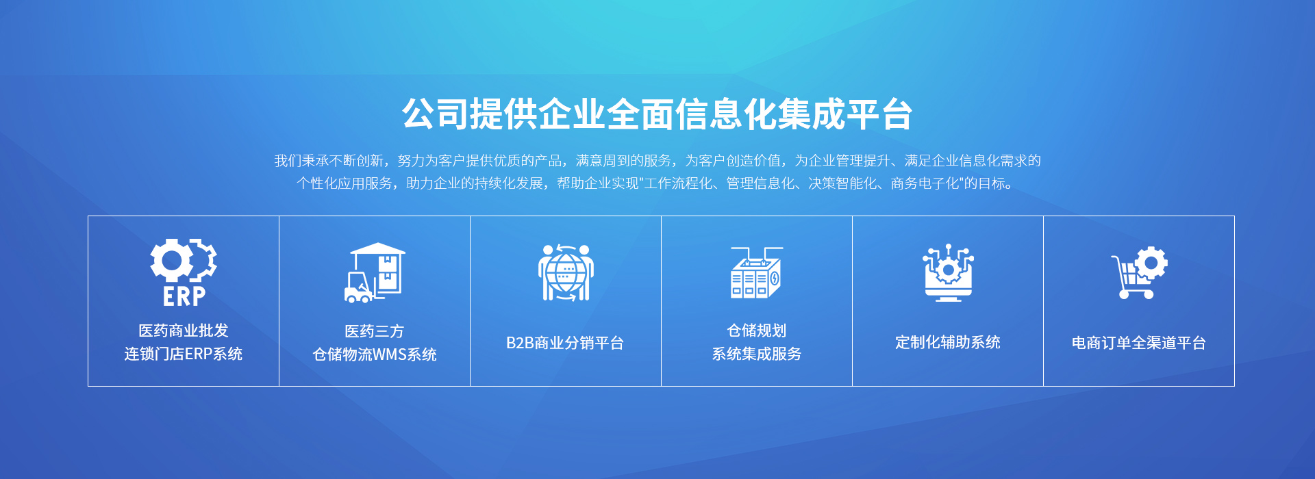 公司提供企業(yè)全面信息化集成平臺(tái),產(chǎn)品包括:ERP供應(yīng)鏈管理系統(tǒng)、WMS倉(cāng)儲(chǔ)管理系統(tǒng)、電子首營(yíng)及藥檢單平臺(tái)、比價(jià)標(biāo)價(jià)系統(tǒng)、小程序商城及開(kāi)發(fā)定制、訂單中臺(tái)系統(tǒng)、B2B電商平臺(tái)、移動(dòng)支付等產(chǎn)品,我們秉承不斷創(chuàng)新,努力為客戶(hù)提供優(yōu)質(zhì)的產(chǎn)品,滿(mǎn)意周到的服務(wù),為客戶(hù)創(chuàng)造價(jià)值,為企業(yè)管理提升、滿(mǎn)足企業(yè)信息化需求的個(gè)性化應(yīng)用服務(wù),助力企業(yè)的持續(xù)化發(fā)展,幫助企業(yè)實(shí)現(xiàn)"工作流程化、管理信息化、決策智能化、商務(wù)電子化"的目標(biāo)。